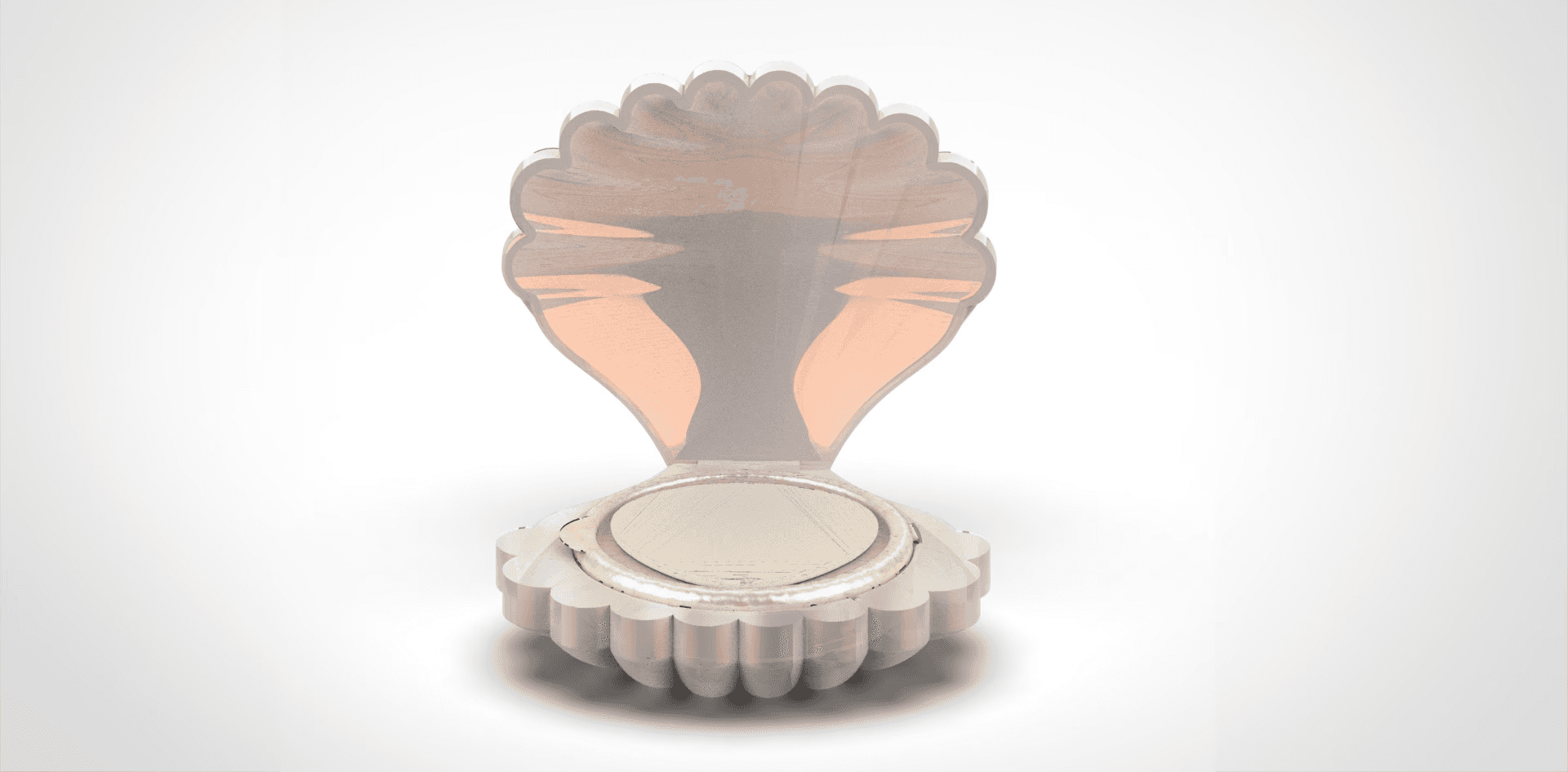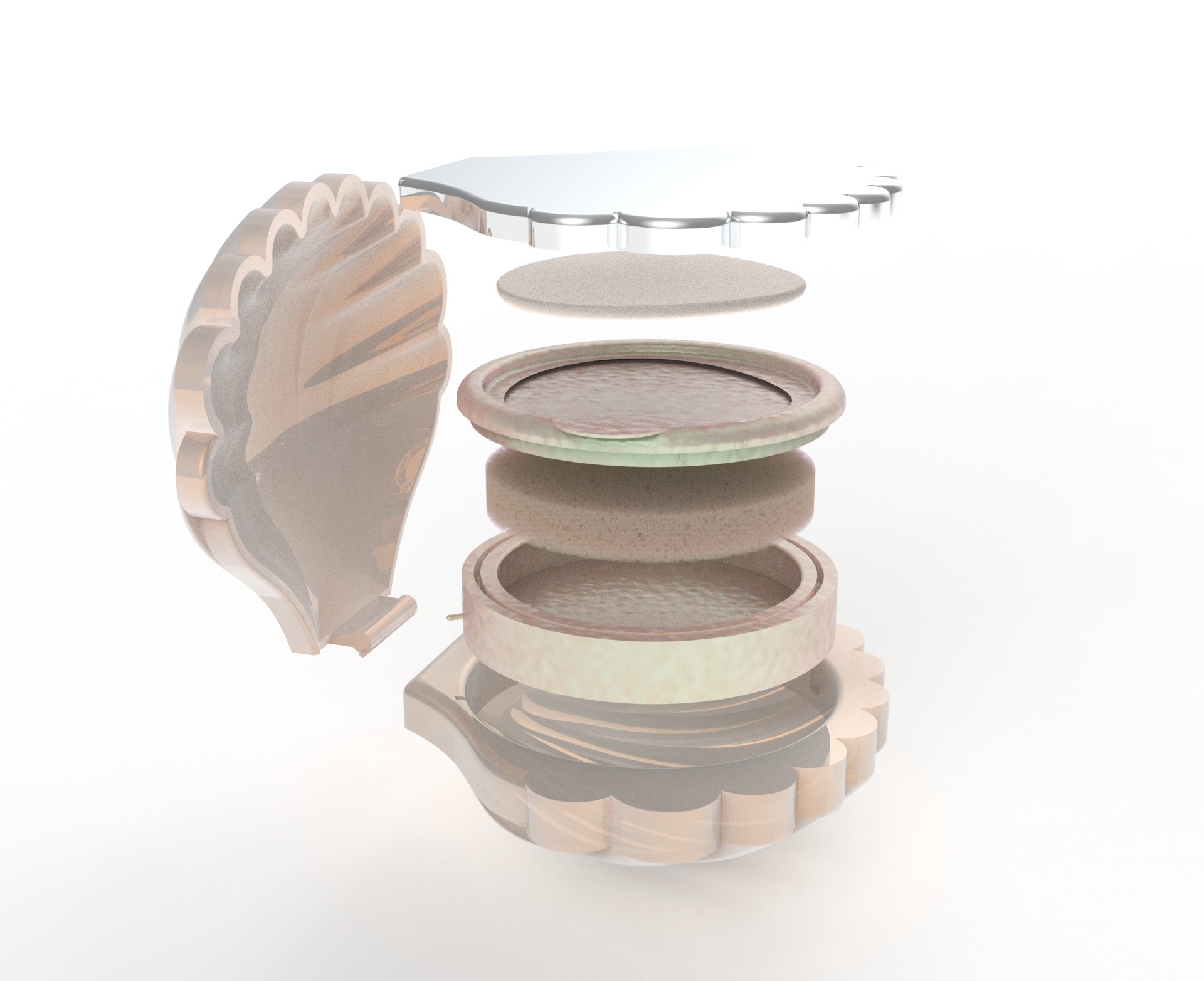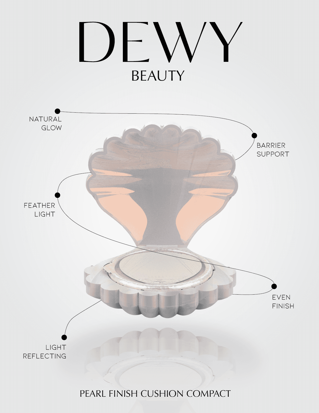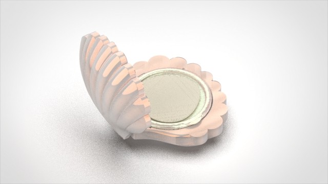 The hero product, the Pearl Finish Cushion, is shown below. It is a 3D modeled and rendered mockup of a cushion compact. This compact is meant to give you a natural radiance and help you break out of your shell to find your natural beauty inside. It has new ergonomic features such as a bayonet mount for the foundation replacement and a removable mirror.